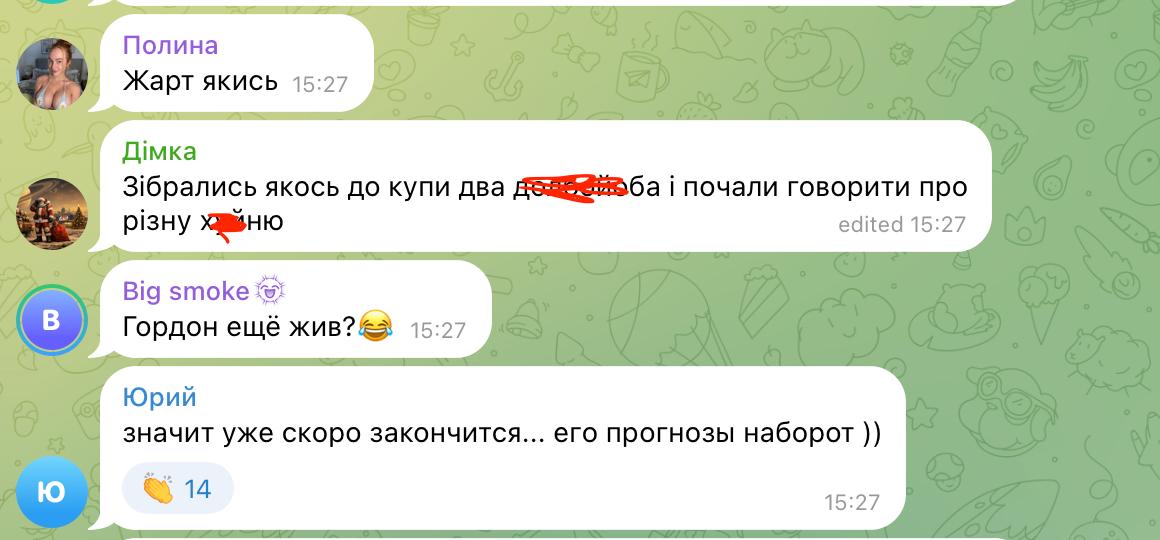 Это также отметили и пользователи в комментариях в Telegram. Они еще вспомнили, что Гордон в принципе любит делать прогнозы по войне и ее завершению, но еще ни один не сбылся. Как например, что война закончится в декабре 2025 года или в конце 2024 года.