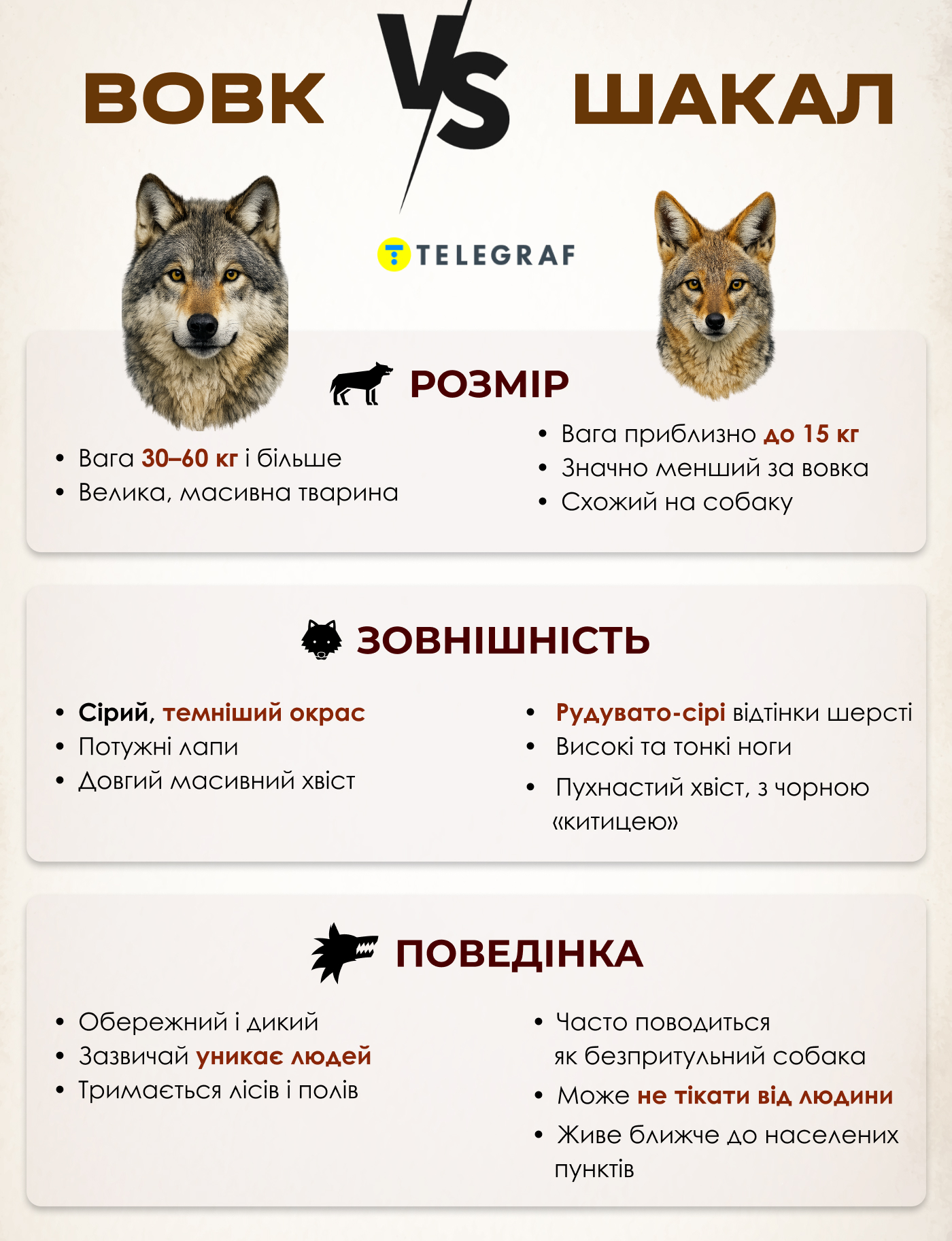 Внешность и поведение волков и шакалов, популяция которых в Украине увеличилась в последнее время, настолько отличается, что спутать их невозможно. Шакалы намного меньше по размеру и имеют тонкие ноги и черную кисточку на конце хвоста.