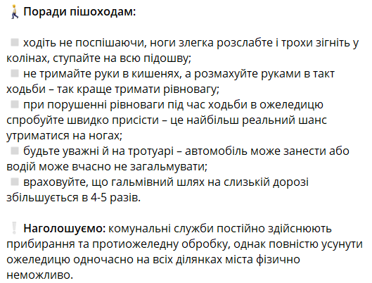 Киевская городская государственная администрация опубликовала список советов жителям столицы, в которых порекомендовала быстро приседать при потере равновесия, чтобы не падать, потому что коммунальщики не успевают устранить гололед.