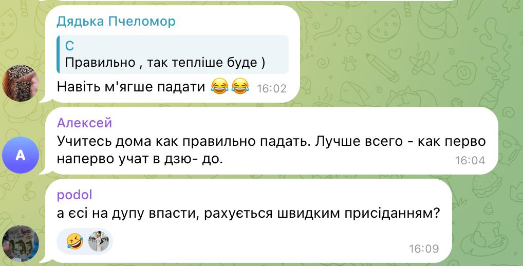 Комментаторы стали развивать эту тему дальше, предлагая дополнительные способы сохранить здоровье при ходьбе по скользким улицам. Кто-то абсолютно логично предложил надеть шлем, чтобы уберечь голову. Напомним, 19 января в Киеве мужчина поскользнулся из-за гололеда, разбил голову и погиб по дороге к метро.