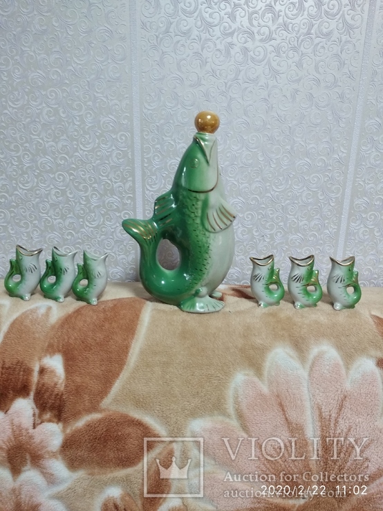 Сервиз под названием "Семейство карпов", а в народе просто "Рыбки" — это графинчик объемом около 700 мл и стопочки на 30-40 мл. Поскольку пить из них было не очень удобно (в силу особенностей статуэтки питье часто проливалось мимо рта), то эти сервизы стояли в сервантах как дань моде.