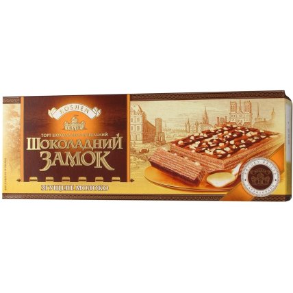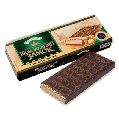 "Шоколадный замок" — компактный вафельный торт весом около 220 г, полностью покрытый шоколадной глазурью. Внутри — тонкие хрустящие вафельные лепешки с кремовой прослойкой. Существовало несколько вариантов: с ореховым кремом, сливочно-ванильным и со вкусом сгущенки. Сверху торт украшал дополнительный узор из темного шоколада, что придавало десерту почти "премиальный" вид — несмотря на вполне демократичную цену.