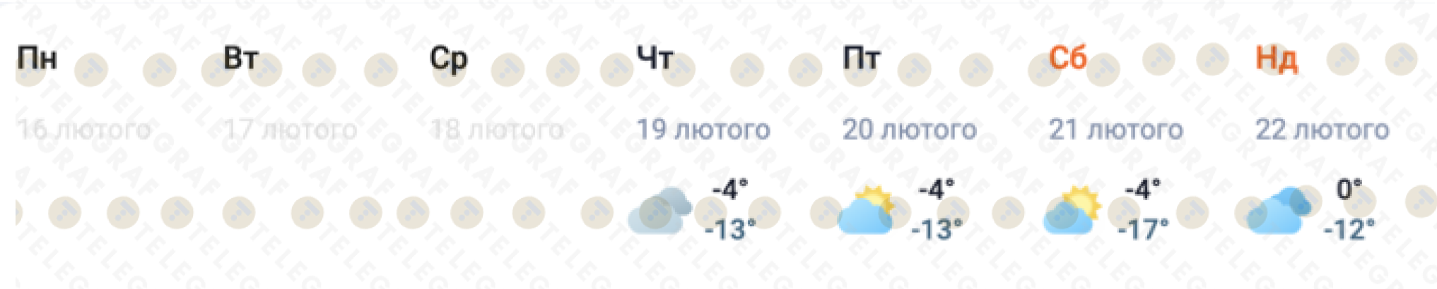 В четверг и пятницу, 19–20 февраля, дневная температура будет держаться на отметке около -4°C, однако ночью столбики термометров стремительно опустятся до -13°C на фоне облачной погоды с редкими прояснениями.