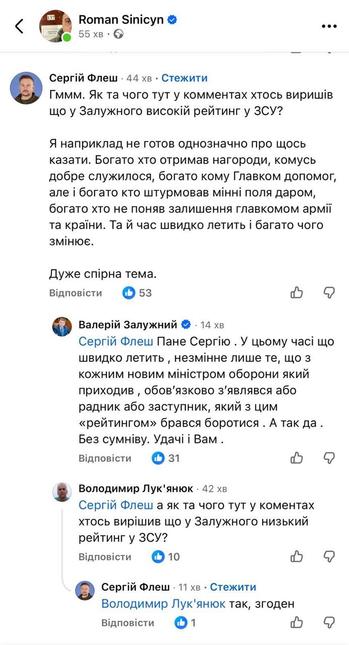 Эту перепалку уже отметили медийные люди и журналисты, так корреспондентка Юлия Кириенко добавила: "Настают времена игры в политику. Блогер, назначенный советником МО Сергей Флеш, решил тоже этим заняться. Пришел спрашивать о рейтингах генерала Валерия Залужного в войсках".