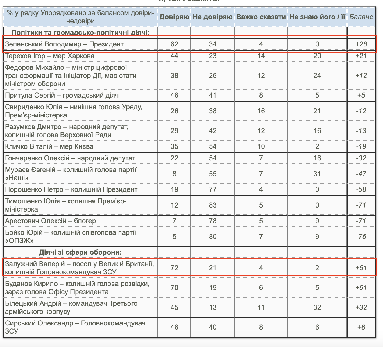 При этом рейтинг Залужного в этом же опросе следующий: 72% украинцев доверяют, 21% не доверяют, а баланс составляет +51%.