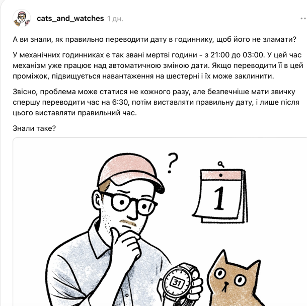 В сети Тредс появилось сообщение от cats_and_watches. Там расскажи владельцам механических часов, как их правильно переводить.