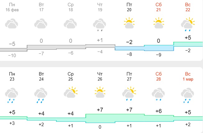 Схожий прогноз дают и синоптики сервиса Meteo.ua. Они считают, что с 22 февраля и до конца месяца в областном центе столбики термометров могут дойти до +12 градусов. Возможны осадки в виде дождей.