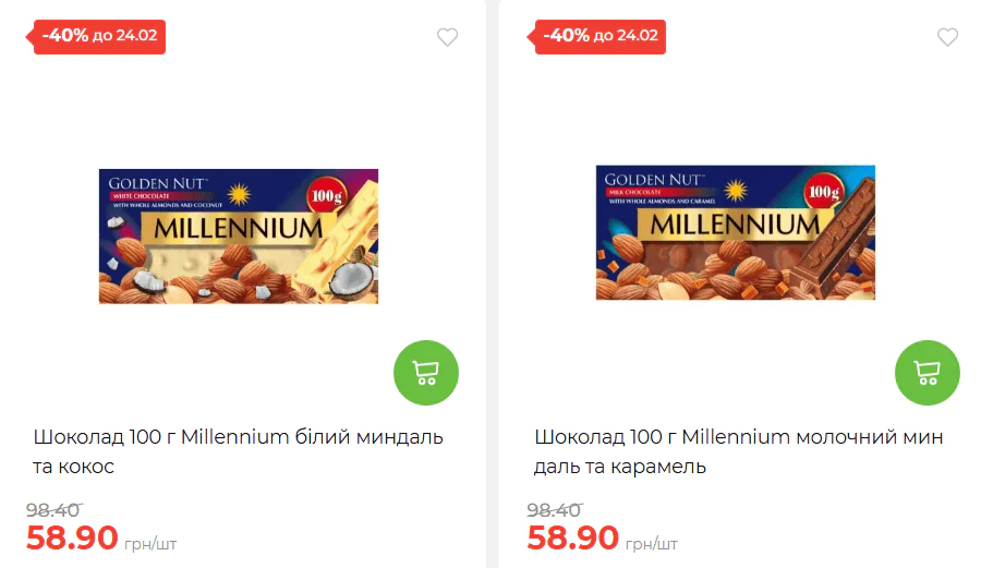 Также по акции продают белый шоколад Millennium весом 100 г с миндалем и кокосом. Цену снизили с 98,40 грн. до 58,90 грн. Скидка также составляет 40%.