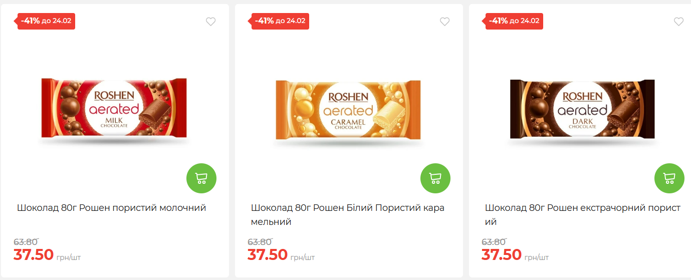Со скидкой в 41% сейчас можно купить три вида пористого шоколада от Рошен: молочный, белый карамельный и экстра черный. Цена по акции — 37.50 грн за плитку весом 80 грамм, сообщается на сайте "АТБ". Цена без скидки — 63.80 грн.