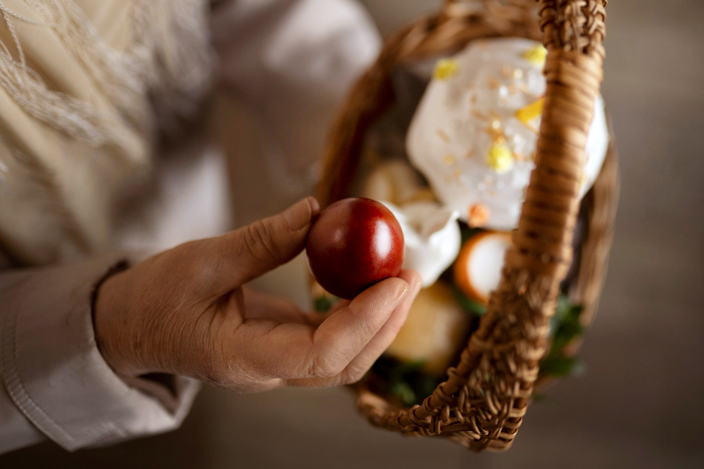 В пасхальную корзину традиционно кладут паску, крашеные яйца (писанки и крашанки), колбасу, сыр, сливочное масло и хрен. После ночной или утренней литургии семьи собираются за праздничным столом и приветствуют друг друга словами: "Христос воскрес!" — "Воистину воскрес!".