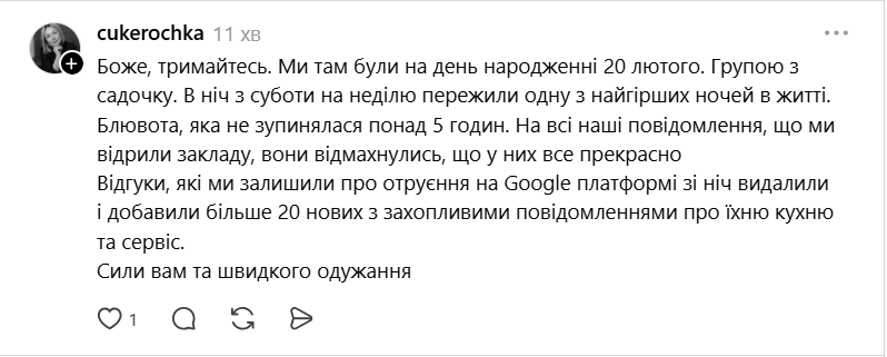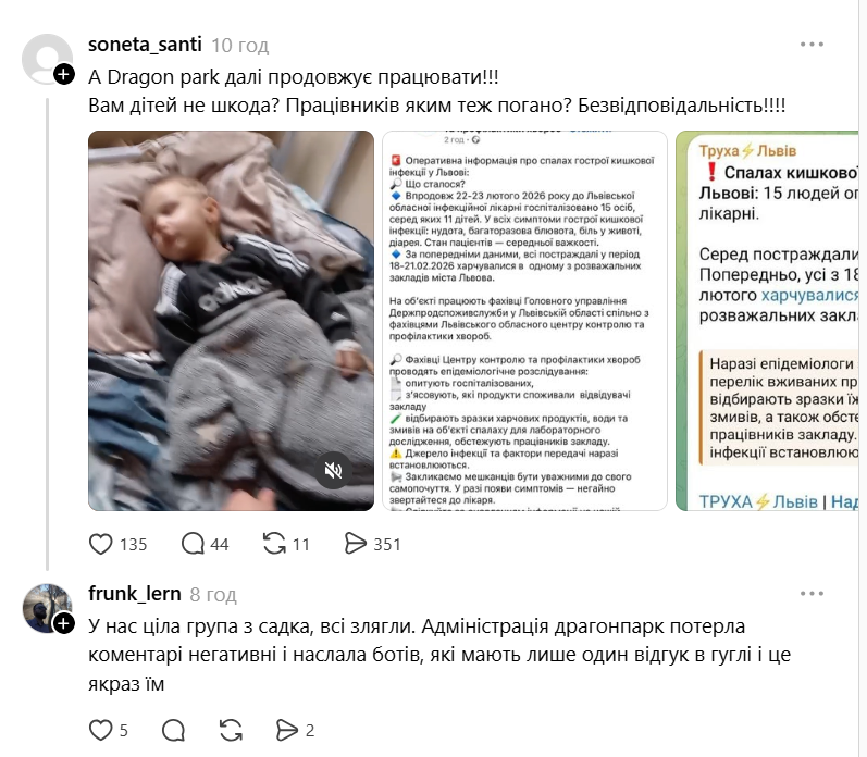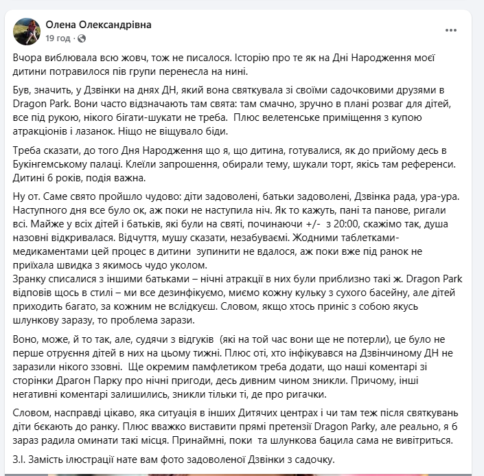 "Мы были в Драгон парке 20.02 на дне рождения, также на следующий день почти все гости имели такие симптомы (рвота, диарея, головная боль, лихорадка). И через день заболели и родственники, которые не были на дне рождения", — отмечает Кристина.