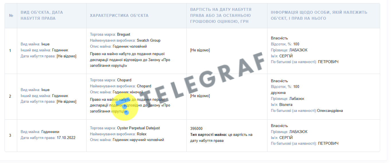 • Rolex Oyster Perpetual Datejust (собственность Сергея Лабазюка) — указанная в декларации стоимость 395 000.