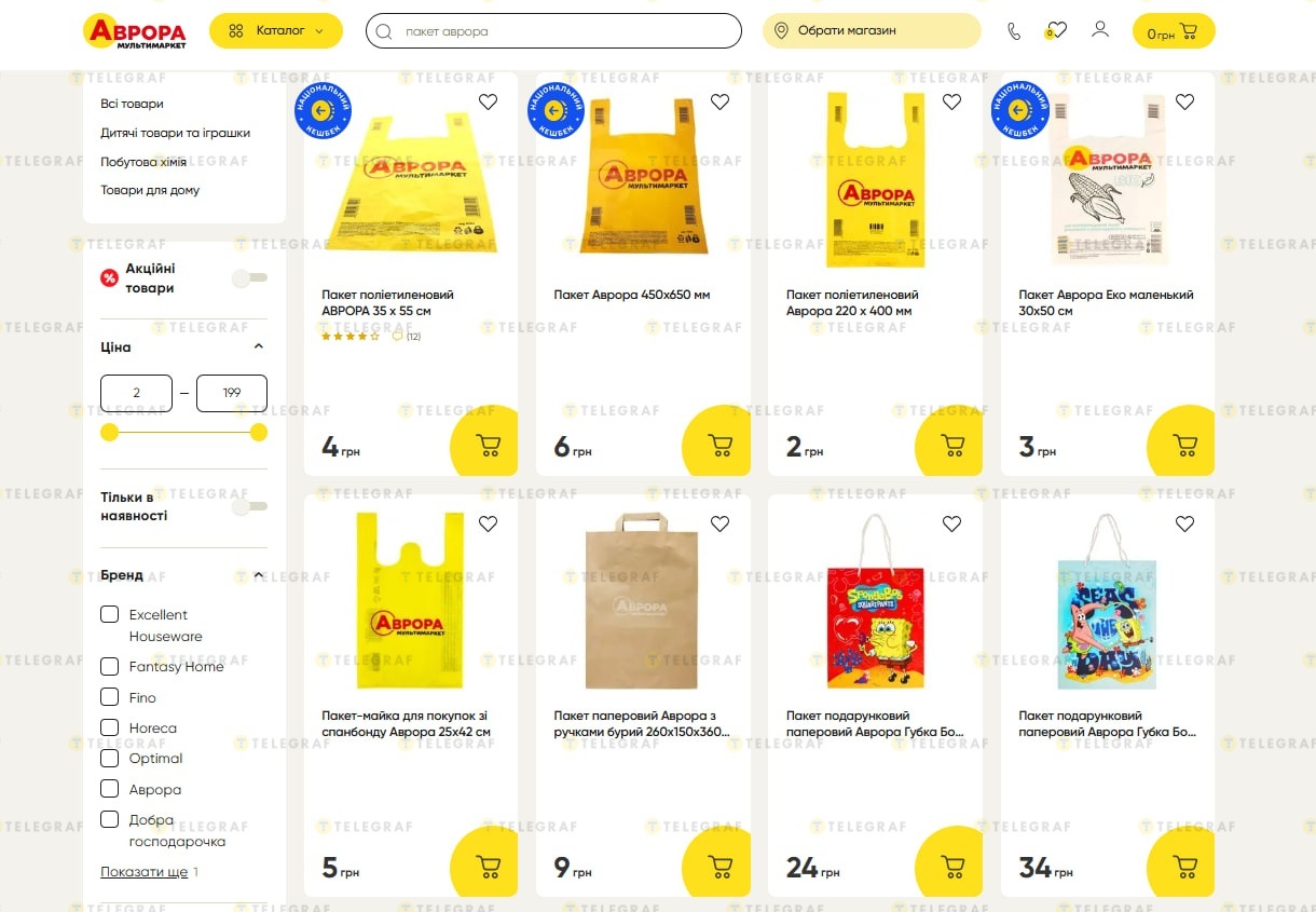 В "Авроре" цены колеблются так: большие пакеты — 2-6 грн, одноразовые — 3 грн. Здесь каждый день можно экономить от 0,86 до 2,58 грн.