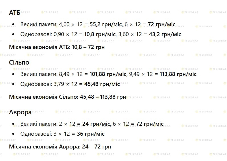 В сети "АТБ" большие пакеты стоят от 4,60 до 6 грн, а одноразовые — от 0,90 до 3,60 грн. Отказ от них позволяет экономить от 0,39 до 2,58 грн в день.