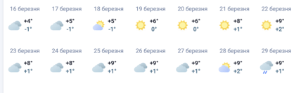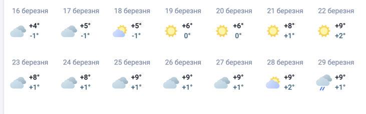 • В конце месяца, в период с 25 по 29 марта, весна окончательно закрепится в Киеве. В эти дни ожидается стабильное тепло до +9°C, хотя яркие солнечные часы могут время от времени чередоваться с лёгкой облачностью и первыми весенними дождями.