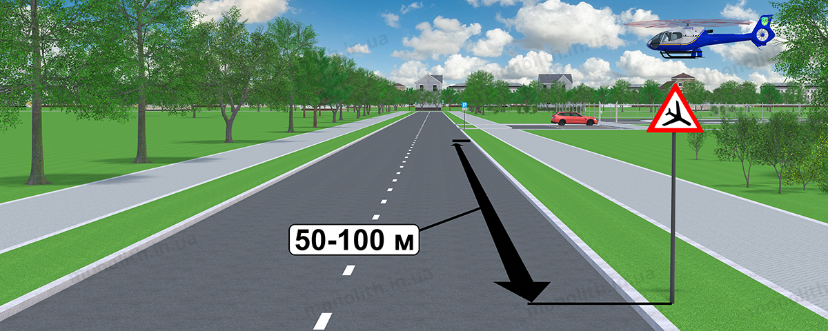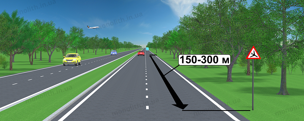 Этот знак за пределами населенных пунктов размещают за 150-300 метров до опасного участка, а в пределах города или села — за 50-100 метров до его начала.