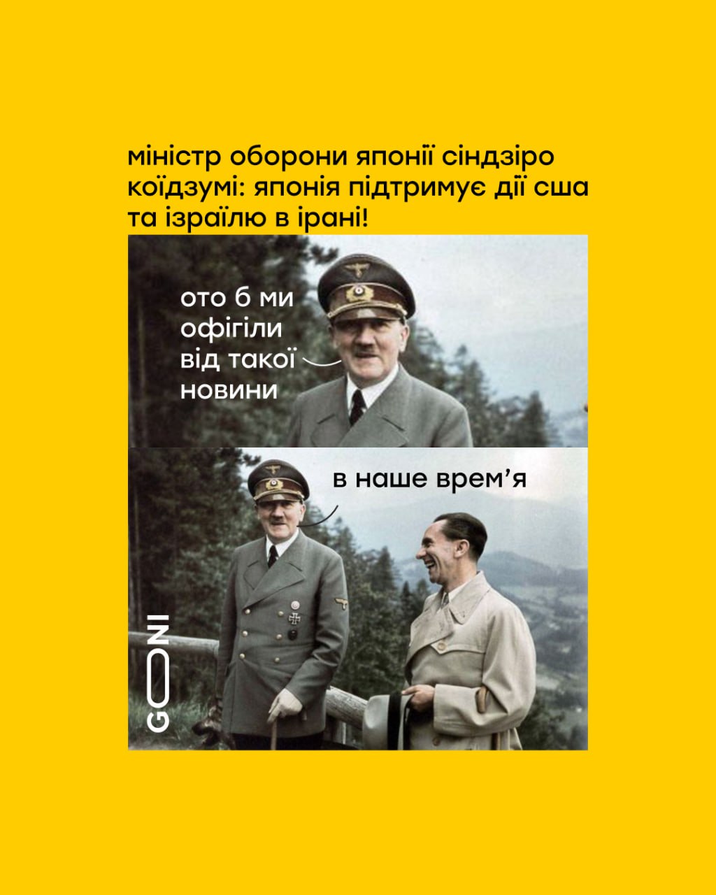 На еще одном меме изображены Адольф Гитлер и Йозеф Геббельс. Они смеются, якобы услышав новость, что Япония поддерживает действия США и Израиля в Иране.