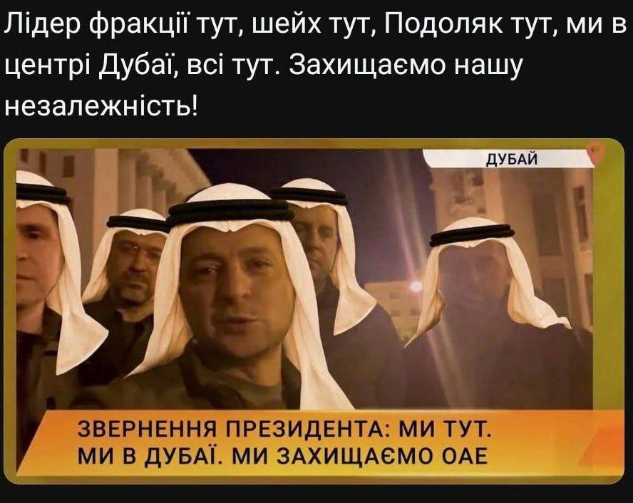 "Обращение президента: Мы здесь. Мы в Дубае. Мы защищаем ОАЭ", — шутит автор.