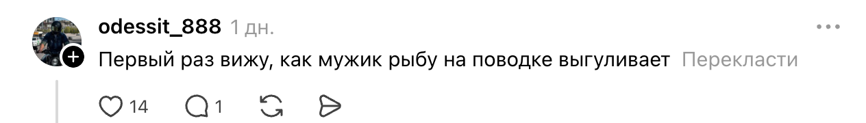 Сообщение опубликовала киевлянка, показав, как сейчас выглядит утро на Оболони в Киеве. Однако на кадрах по меньшей мере две вещи бросаются в глаза. Первая — мужчина, поймавший крупную рыбу, не несет ее в ведре или руках, а просто тянет будто за поводок. Вторая – размер рыбы. Хотя автор не отмечает ни вес, ни длину улова, видно, что это достаточно крупный экземпляр.