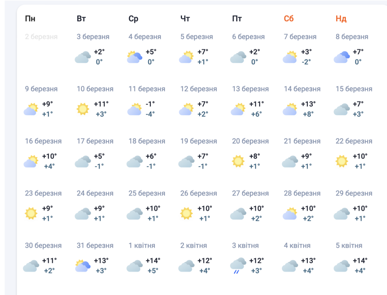 Настоящая теплая волна накроет Днепр во второй половине месяца. 10 марта порадует солнечной погодой и температурой до +11°C. А вот 13-14 марта станут "золотым периодом" середины месяца с показателями +11°C… +13°C днем.