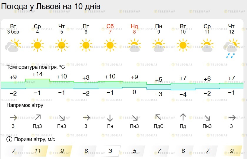 В первые дни недели температура воздуха будет днем колебаться в пределах +9…+14 градусов. Особенно теплой ожидается среда, когда в город придет аномальное потепление до +14. Ночные температуры будут оставаться близкими к нулю или опускаться до небольших "минусов" — от -2 до -1 градуса. Очень тёплая и преимущественно солнечная погода, как для марта, продержится до конца этой недели.