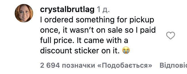 - Когда я заказала кое-что на самовывоз, его не было в продаже, поэтому я заплатила полную цену. Но товар был с наклейкой со скидкой.