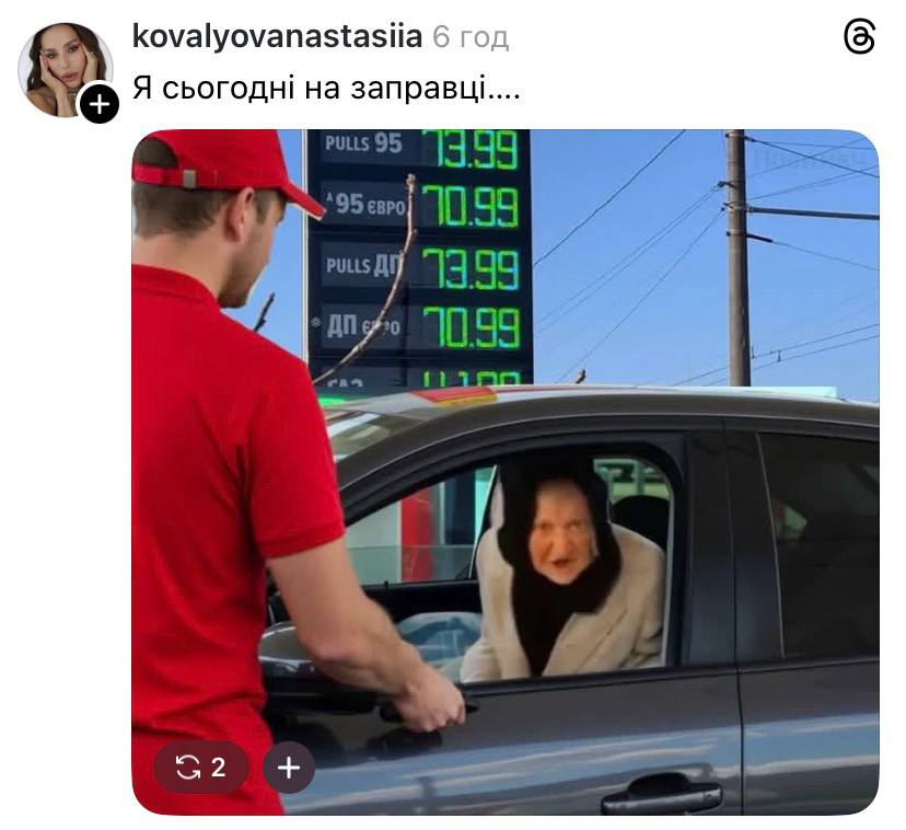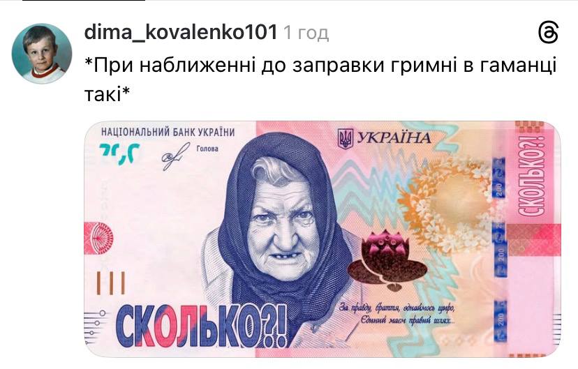 Немалое количество мемов создали с известной бабушкой, которая на видео громко спрашивала "Сколько?" По словам пользователей, именно так они ведут себя на АЗС, когда им озвучивают стоимость заправки.