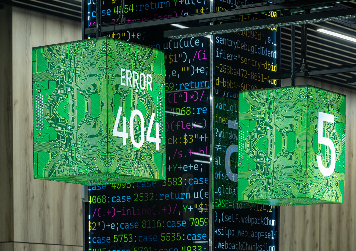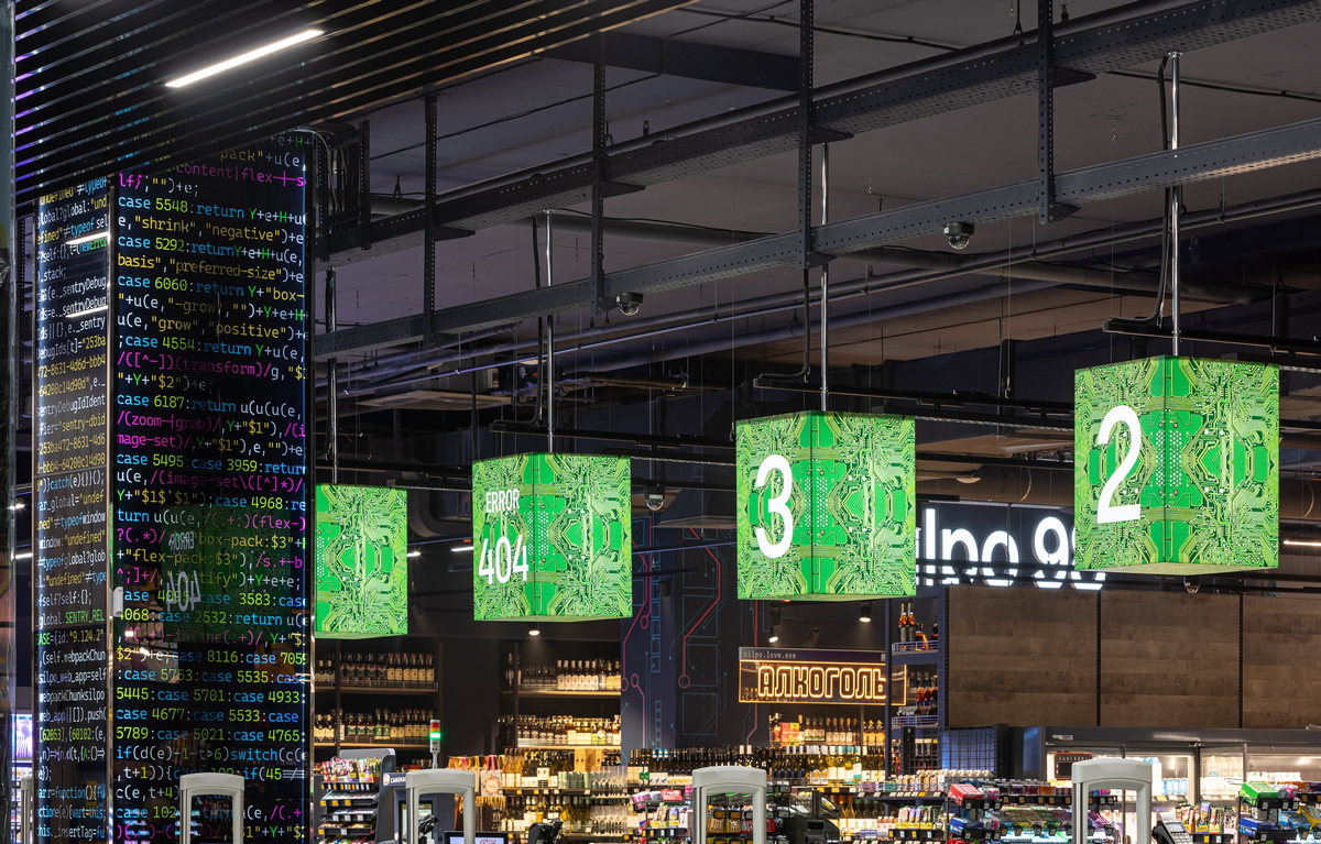 Интерьер супермаркета погружает гостей в мир киберкультуры. Там продемонстрирована эволюция от первых компьютеров к современному киберспорту. Интерьер наполнен тематическими деталями: входную вывеску сформировали с клавиш клавиатуры, кассовые зоны оформили в виде микросхем, а одна из касс имеет номер 404.