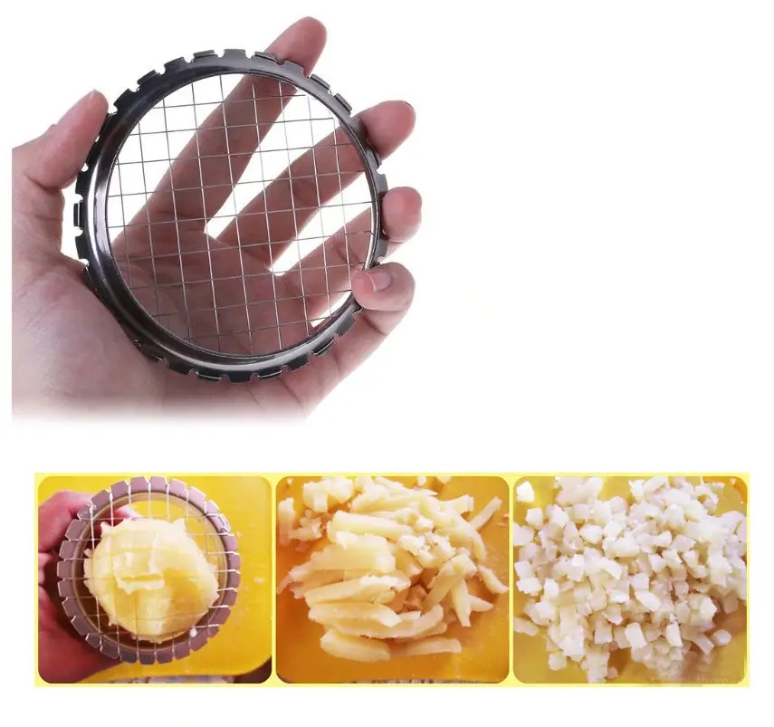 Интересно, что у этого кухонного приспособления есть много названий. В частности, яйцерезка, салаторезка, овощерезка, винегретница, сетка для нарезки овощей и яиц и т.д. Она предназначена для быстрого измельчения вареных овощей (картофеля, моркови, свеклы), яиц, сыра и мягких фруктов на кубики для салатов (оливье, винегрет).