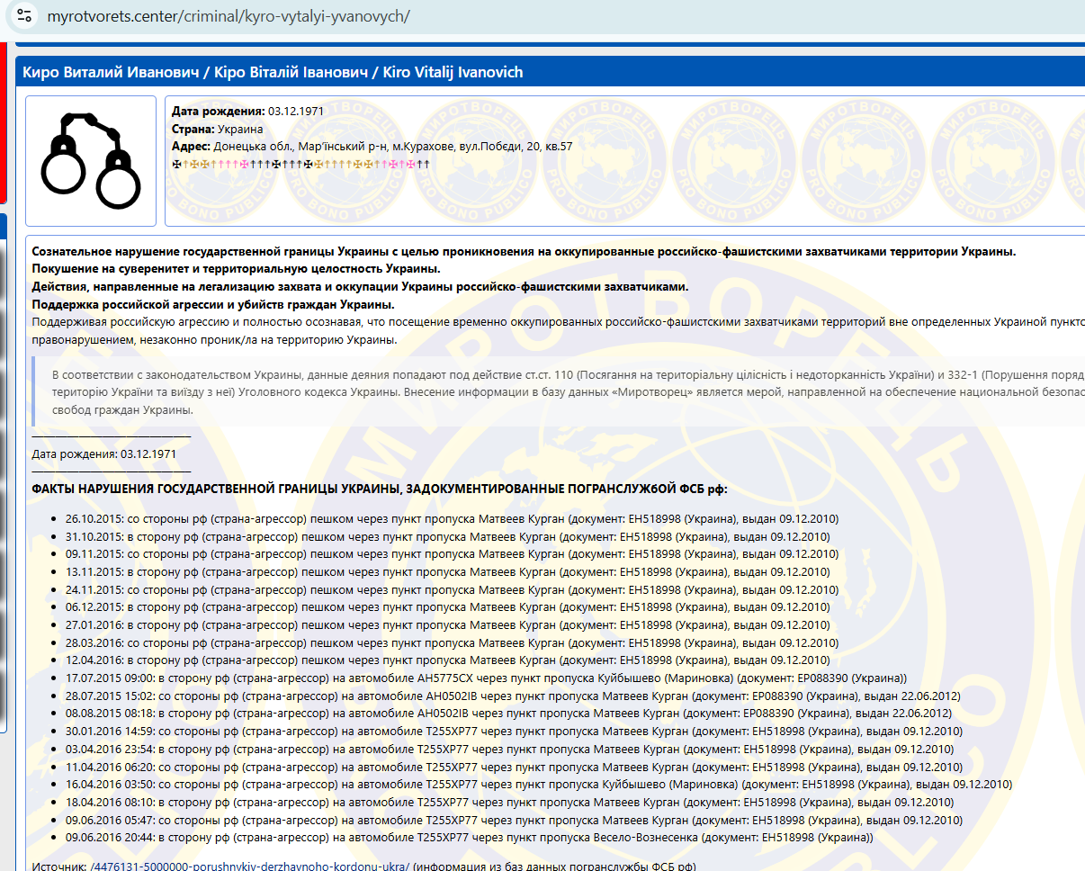 И Ольга, и Виталий Киро – фигуранты "Миротворца". При этом на сайте "Миротворца" нет информации о том, что это семья, которая имеет отношение к крупному бизнесу. В перечень они попали из-за слитой базы ФСБ РФ с данными о пересечении границы. Так, на сайте "Миротворца" утверждается, что Виталий Киро по меньшей мере 19 раз нарушал границу Украины — ездил с оккупированной территорию в Россию и обратно.
