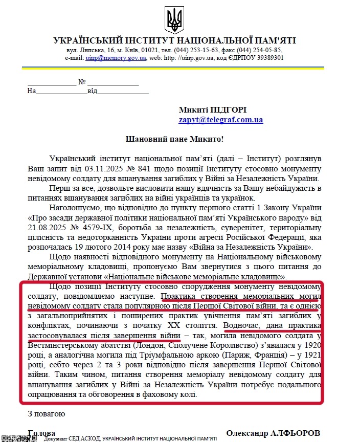 — Дарця, вы жестко раскритиковали УИНП, Минветеранов и другие органы за фактическое торможение создания памятника Неизвестному погибшему воину — мол, не хотят этим заниматься из-за сложности темы, нежелания получить обвинения в "совковости" и обещания полной идентификации павших. Так почему, по вашему мнению, Украине нужен этот монумент — и должен ли он появиться уже сейчас? Потому что мы спросили УИНП, и там ответили, что не против памятника, но, по их мнению, этот вопрос — на время после окончания войны…