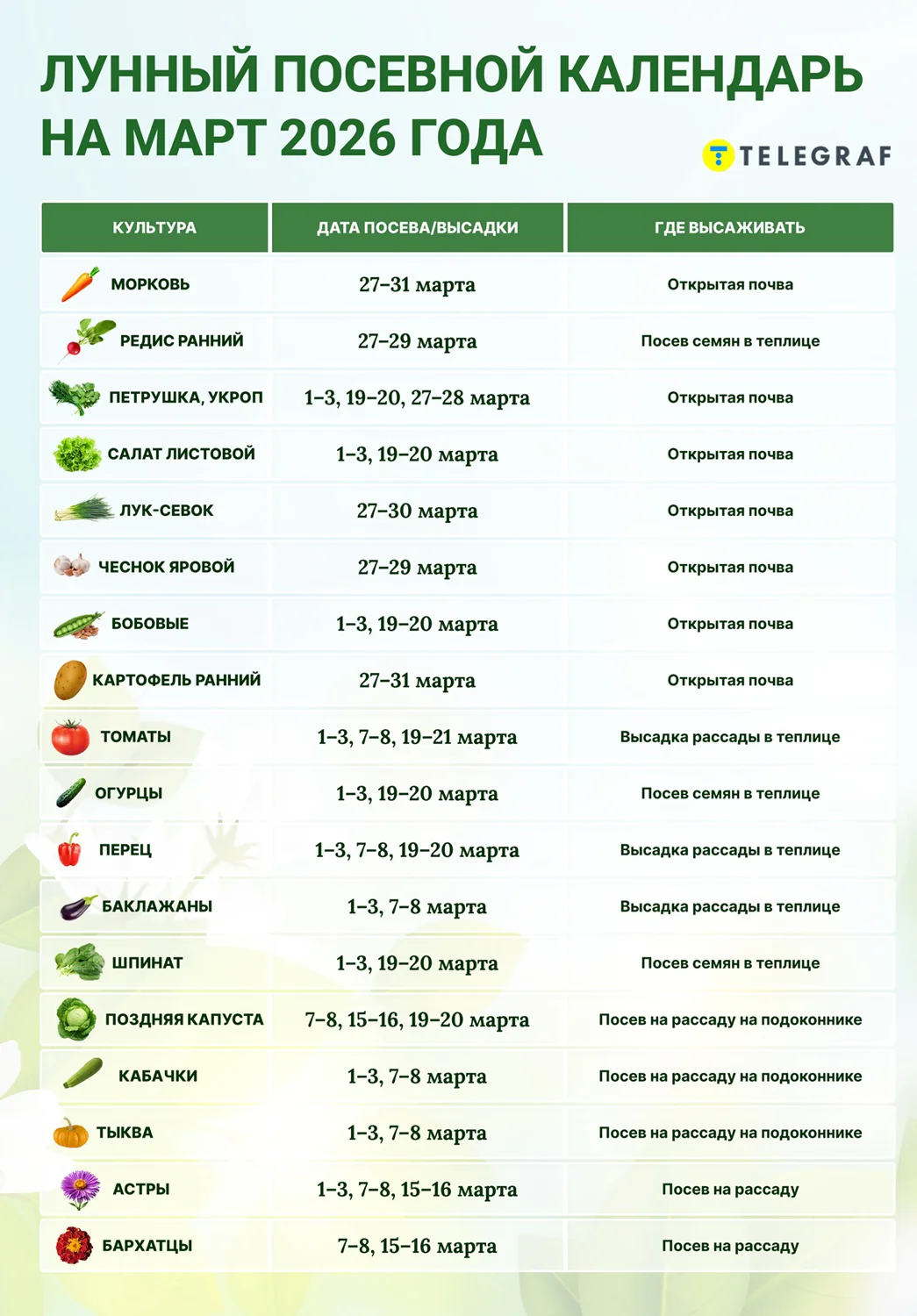- Посев семян или высадка рассады тепличных культур (томаты, перец, огурцы, баклажаны, шпинат) — преимущественно в начале месяца (1-3 марта) и в середине/конец (7-8, 19-21 марта).