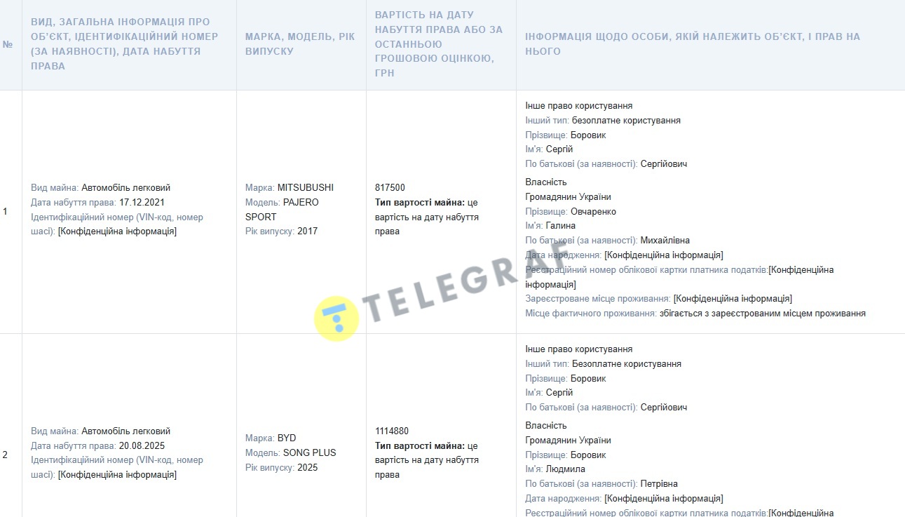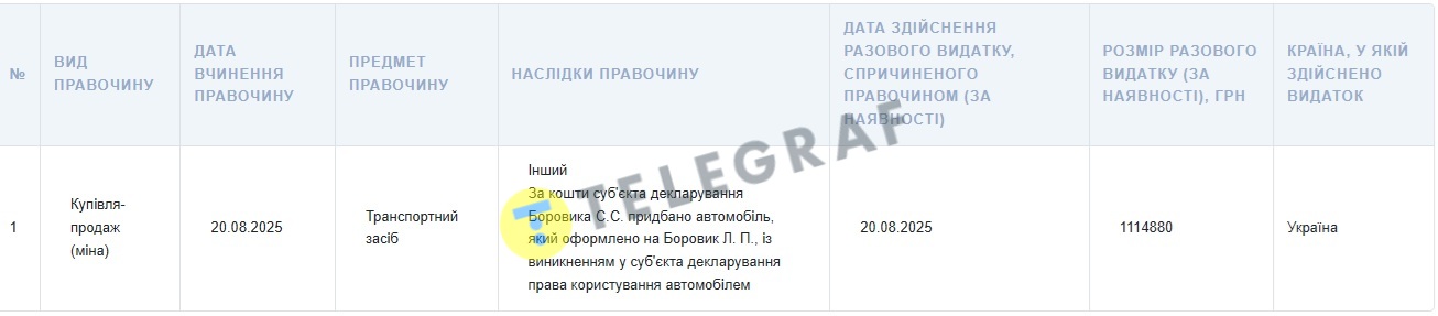 Об этом свидетельствуют данные в ежегодной декларации судьи, опубликованной на сайте НАПК. Согласно документу Боровик в августе 2025 года приобрел автомобиль BYD Song Plus гражданке Боровик Людмиле Павловне (вероятно, родственнице, семейное положение судьи в декларации не раскрыто). Стоимость покупки составила 1 114 880 гривен. Сам судья имеет бесплатное право пользования данным транспортным средством.