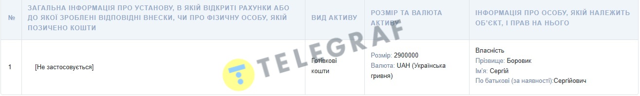Также в документе указано, что судья за 2025 год заработал 1 455 879 гривен и получил 25 тысяч соцвыплат. Из сбережений у Боровика 2 900 000 гривен наличкой.