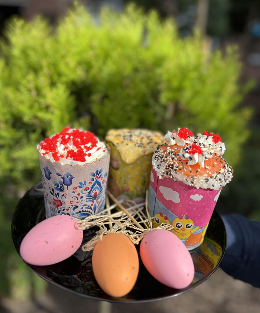 Это буквально привычные для всех паски, даже в картонной обертке, и с украшениями на макушке. Только внутри вместо дрожжевого рыхлого теста — рис, огурцы, сыр, а сверху соленая красная рыба и креветки. Снаружи паски выглядят довольно интересно и привлекательно, а вот разрез удивляет.