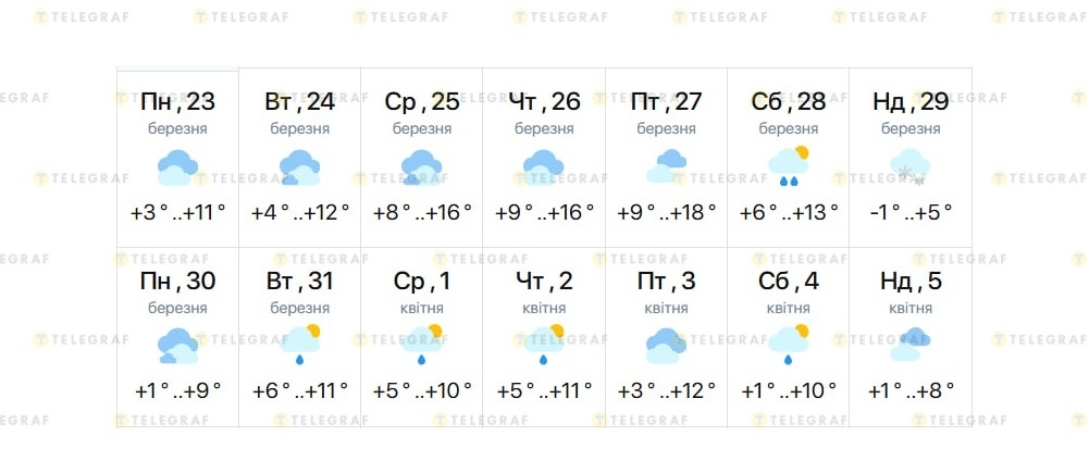 Погода начнет резко меняться в конце недели. В субботу, 28 марта, ожидается дождь и понижение температуры до +6…+13 °C. Наиболее ощутимое похолодание прогнозируют в воскресенье, 29 марта. В этот день в Днепре возможен снег, а ночью температура опустится до -1 °C.