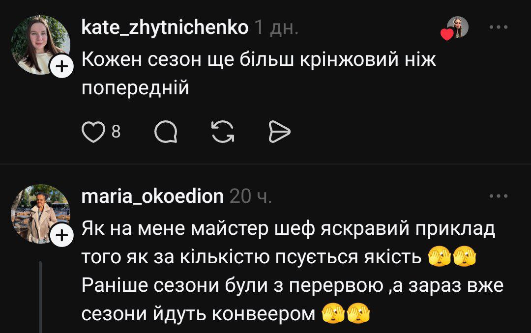 В сети Threads обсудили 17-й сезон шоу "Мастер Шеф". Некоторые зрители считают, что с каждым новым сезоном уровень программы падает и конкурсы для участников становятся проще.