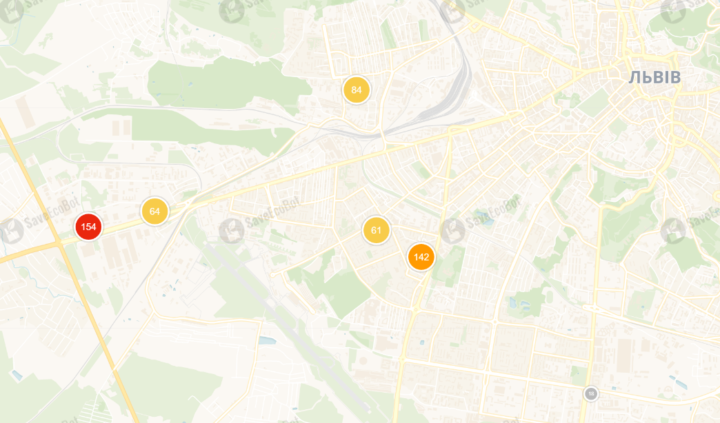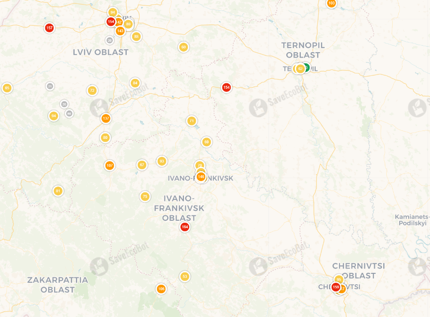 На Тернопольщине загрязнение пересекло красную отметку в городе Бережаны. Там оно составляет 154 единицы при норме 150.
