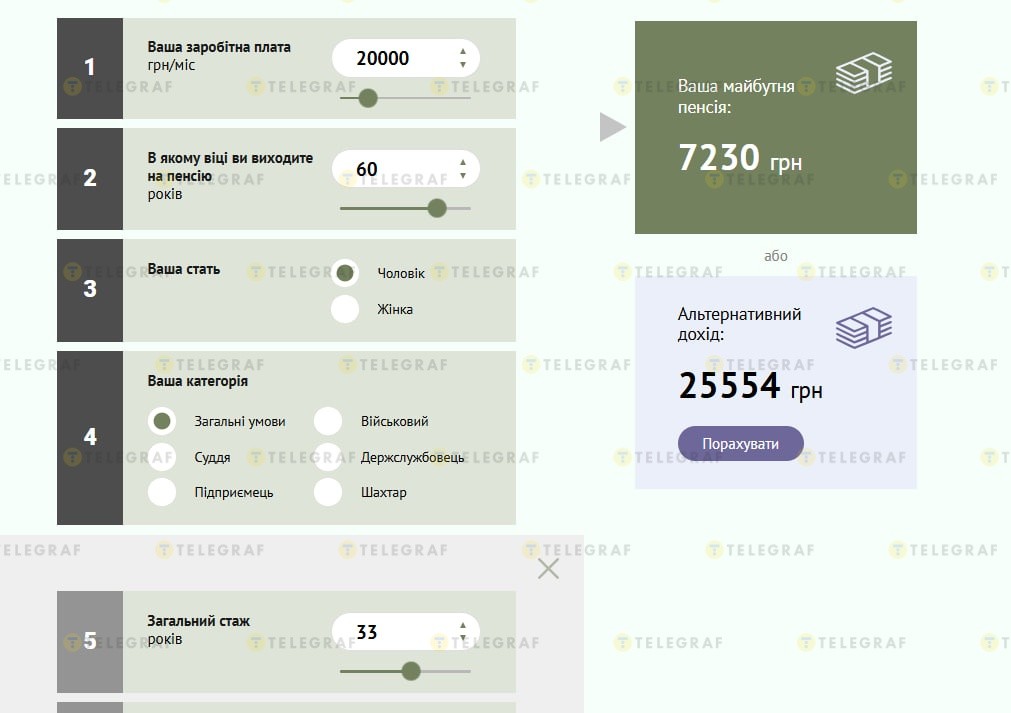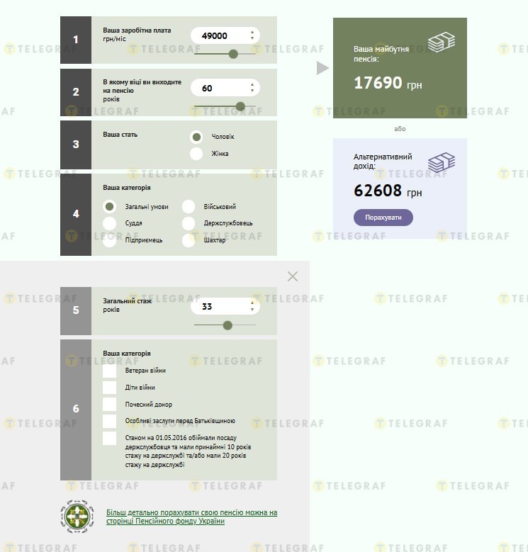 Как посчитал "Телеграф" с помощью пенсионного калькулятора, в 60 лет гражданин с 33 годами страхового стажа может рассчитывать на выплату около 17 690 гривен, если во время работы получал зарплату не ниже 49 000 гривен.