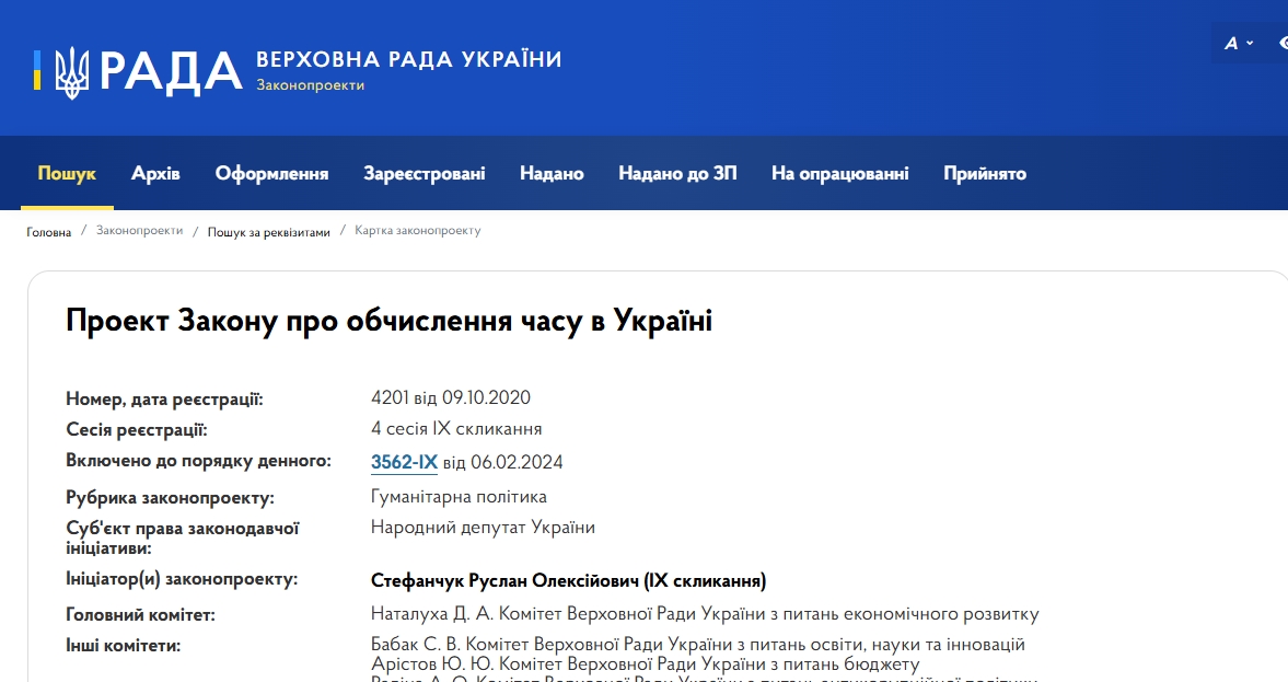 Принятый Верховной Радой Украины в 2024 году, законопроект №4201 предусматривал отказ от перевода часов и установления зимнего времени в течение всего года. Его предлагали назвать "единственным киевским временем" и определить часовым поясом GMT+2.