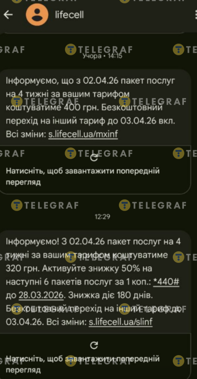 Как отметил корреспондент "Телеграфа", получивший сообщение от lifecell, повышение планировалось с апреля. Сумма нового тарифа за месяц должна была составить 400 грн, но ее изменили на 320 грн. При этом старая цена составляла 300 грн, то есть сначала планировали подорожание на 33%, а сейчас – 6%.