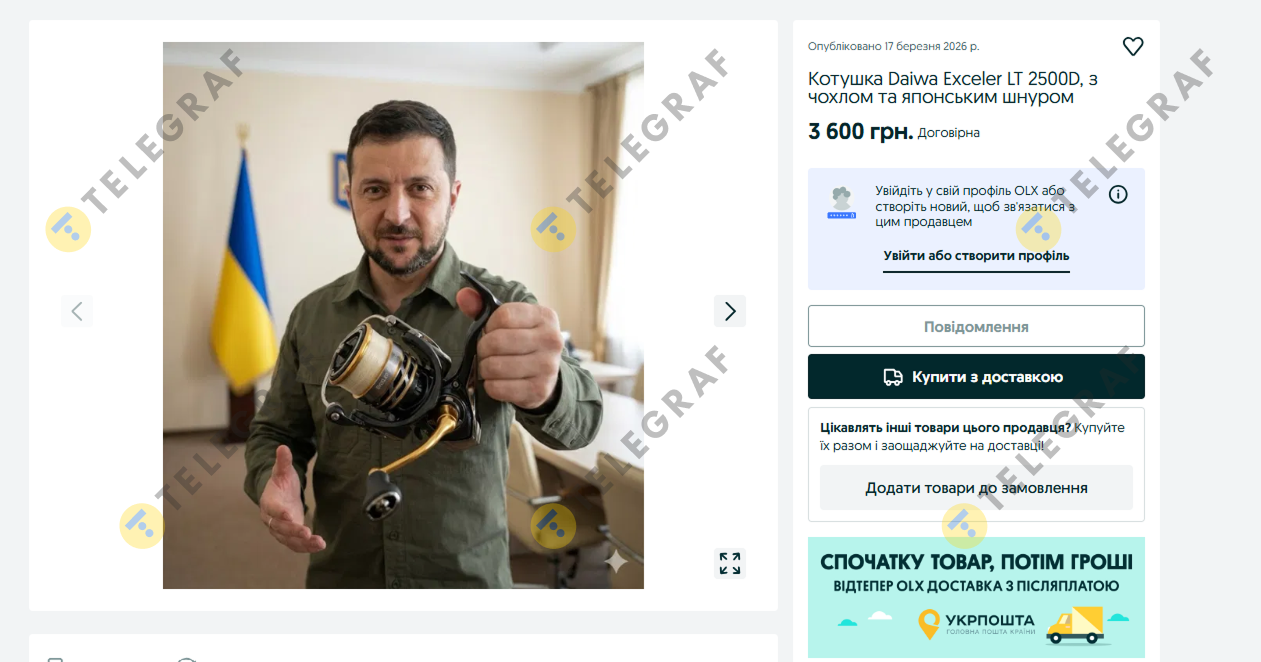 В Украине продать подержанную катушку для удочки пытаются с помощью изображения президента Владимира Зеленского. Оно сгенерировано искусственным интеллектом — на нем президент якобы держит объект продажи.