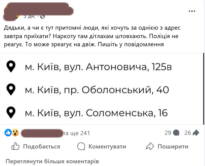 Один из таких призывов, например, 24 марта опубликовал известный медийный военный, предложив проехать по трем адресам в Киеве. "Наркоту там детишкам толкают. Полиция не реагирует. Так может среагирует на движ", — говорится в сообщении и указываются адреса: по ул. Антоновича и Соломенской и на Оболонском проспекте.