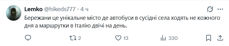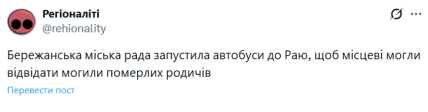 Один из подписчиков отреагировал на новость так: "Бережанский городской совет запустил автобусы в Рай, чтобы умершие родственники могли посетить местных".