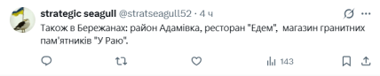 Некоторые соцсети сообщили о запуске дополнительного транспорта сокращенно, что вместе с интересным названием села вызвало волну шутливых комментариев. Например, "Регионалити" написала : "Бережанский городской совет запустил автобусы в Рай, чтобы местные могли посетить могилы умерших родственников".
