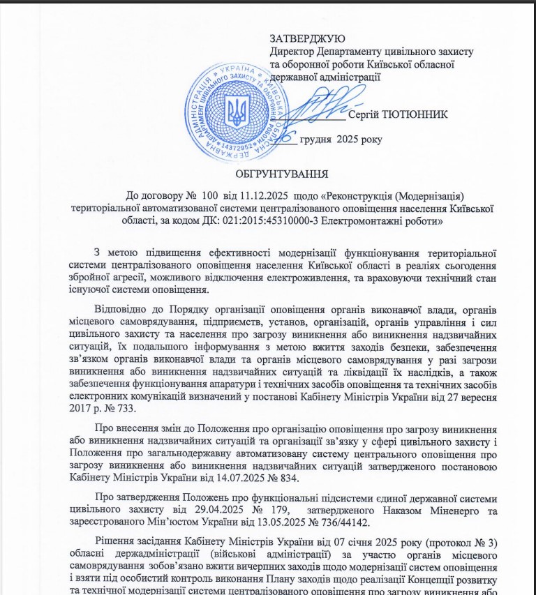 Обоснование к договору утвердил директор Департамента гражданской защиты КОВА Сергей Тютюнник, а подписал начальник отдела оповещения Константин Ромас. Конкретно они персонально несут ответственность за компанию процесса.
