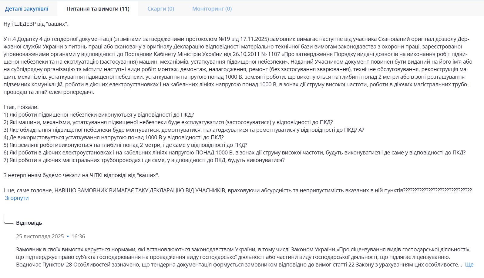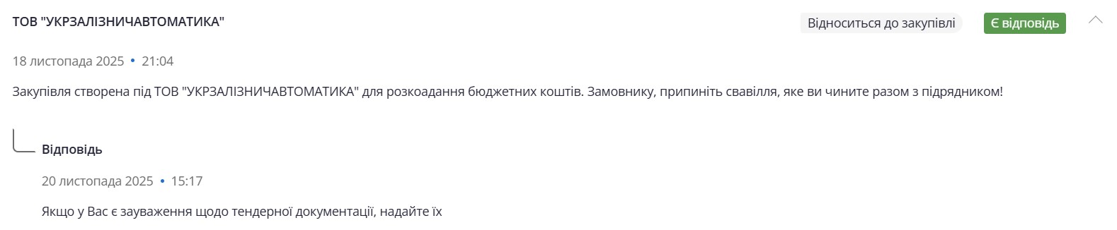 Один из потенциальных заказчиков прямо заявил в замечаниях: "Закупка создана под ООО "Укрзалізничавтоматика" для хищения бюджетных средств. Заказчик, прекратите произвол!"