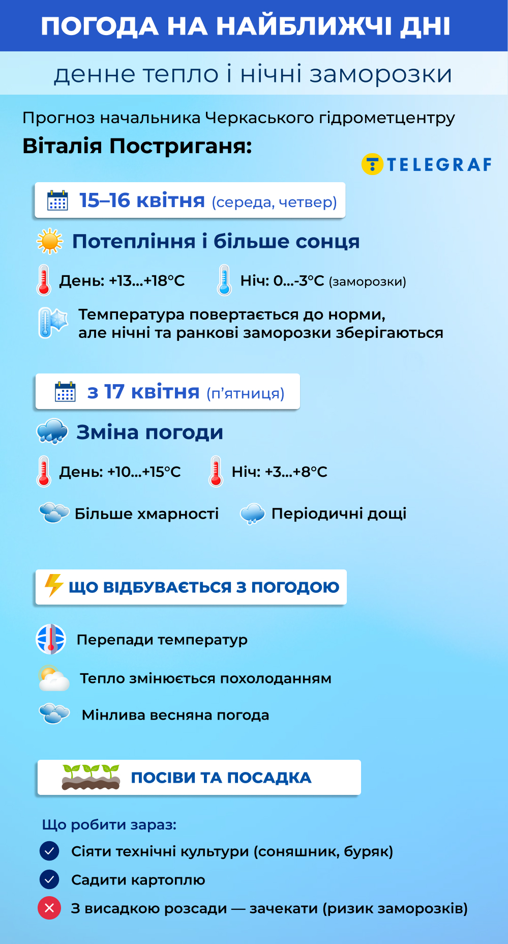 В Украине начинается потепление, однако оно будет недолгим, а период ночных заморозков может затянуться до конца мая. Поэтому садоводам и огородникам приходится постоянно быть наготове. Что принесут ближайшие дни и стоит ли браться за рассаду — на эти вопросы "Телеграфу" ответил начальник Черкасского областного гидрометцентра Виталий Постригань в блицинтервью.
