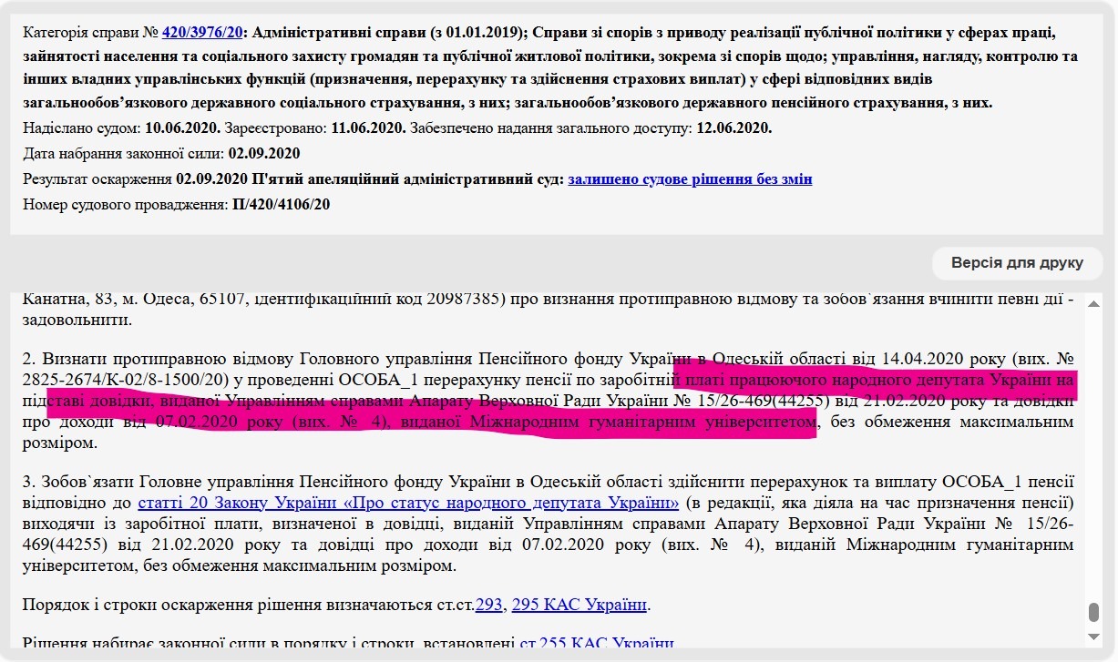 "Суд считает необходимым обязать ответчика осуществить перерасчет и выплату истцу пенсии в соответствии со статьей 20 Закона Украины "О статусе народного депутата Украины" (в редакции, действовавшей на время назначения пенсии), исходя из заработной платы, определенной в справке, выданной Управлением делами Аппарата Верховной Рады № 15/26-469(44255) от 21.02.2020 года и справке о доходах от 07.02.2020 г. (исх. № 4), выданной Международным гуманитарным университетом, без ограничения максимальным размером", – говорится в материалах дела.
