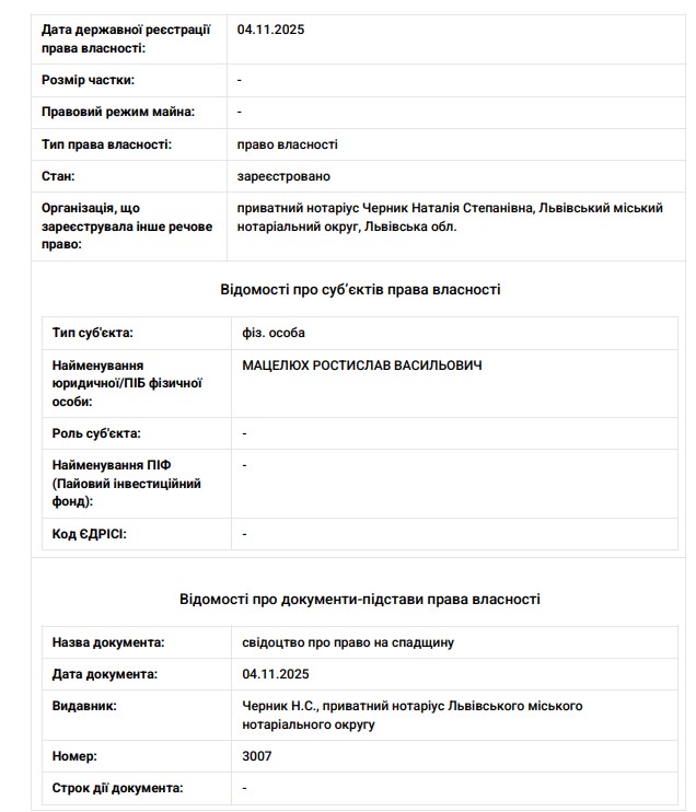 "Телеграф" нашел квартиру, которую глава регионального БЭБ арендует у предпринимателя. Это просторная двухкомнатная квартира в ЖК "Липовая аллея". Ростислав Мацелюх владеет в этом ЖК по меньшей мере тремя квартирами. Интересно, что он их оформил в ноябре 2025 года (уже после того, как в жилье поселился БЕБовец) на основании свидетельства о праве на наследство.